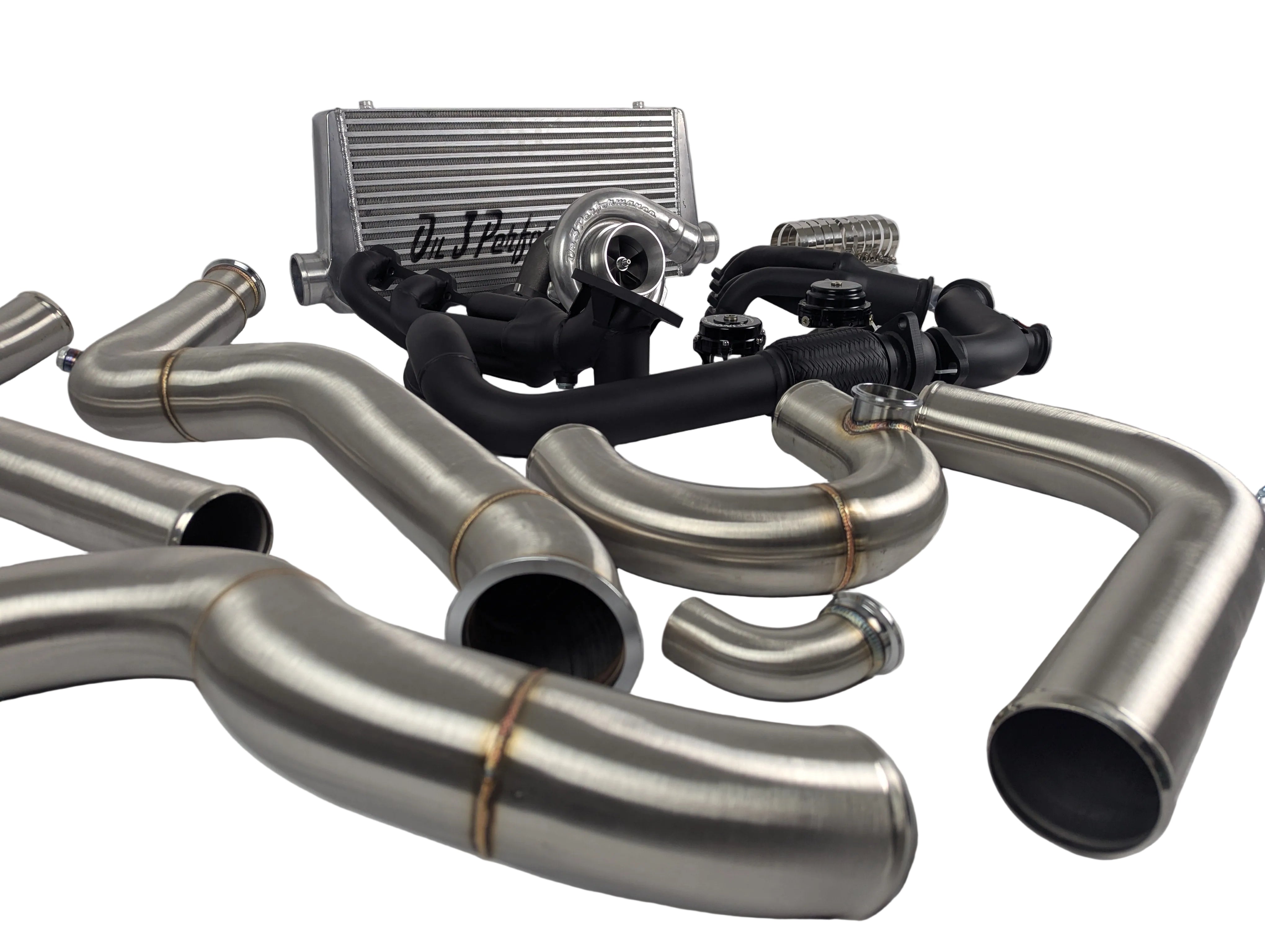 We have a good amount of customers that are running blow-through carb applications and making killer power. Some of our fastest fox customers are on carb applications so we can certainly help you. Most guys first off ask for a discount to leave out the items needed for fuel injection applications. There is not any discounts available, none of the efi items needed are included standard. Then the next most asked question is what all is needed? Well its pretty simple, you're going to need your carb and then the bonnet to bolt on top that would take it to a 3" inlet. Most people will mock up the tubing and see how far it needs to go to connect to their specific application and just order a silicone coupler to length. There are a lot of places that offer longer lengths that you can just simply cut to desired measurements and use. There really isn't too much to the blow through applications
