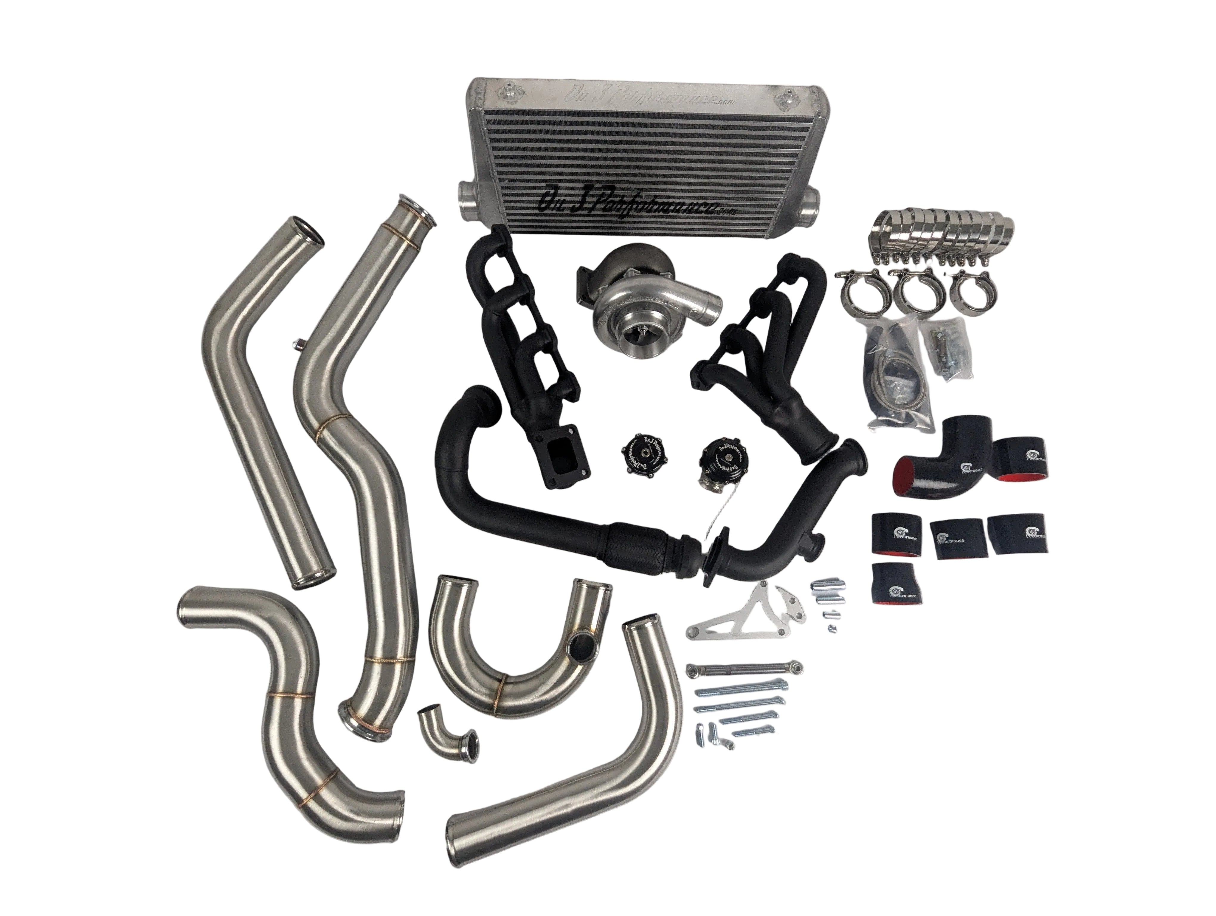 We are introducing our new kit for the foxbody cars with 5.8 351 swapped 1986 - 1993 cars. This system follows our same design as our already popular 5.0 kits with the tweaks needed to make it a bolt on setup for your 351. As you will see from our photos, this kit bolts on to your car and was actually designed and tested by us so we know the kit and we know it works as you can see from our list of parts included in this kit, it is just about all the hard components that you need to install the single turbo kit on your car. A lot of people call in to find out what in addition to the kit they will need to finish off the kit. We offer a bunch of accessories/options listed below to help finish off the kit.