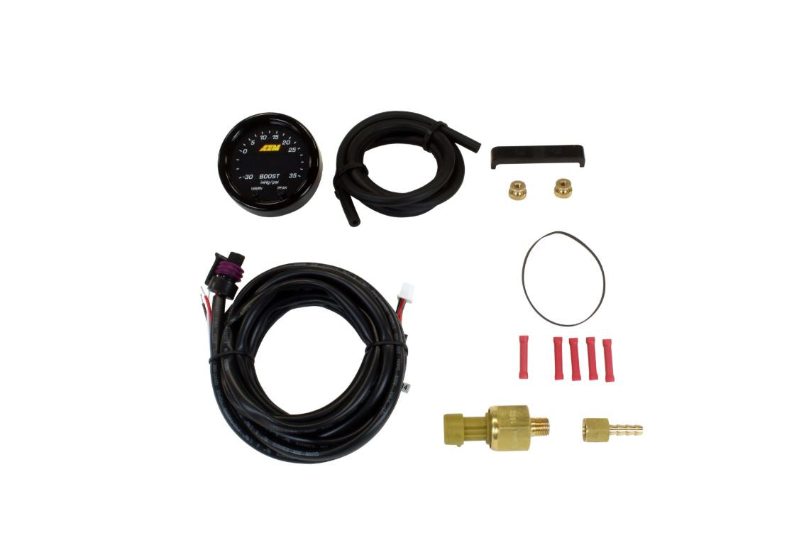 AEM's 30-0306 X-Series -30in/Hg~35PSI / -1~2.5BAR Digital Boost Display gauge combines incredible looks, increased readability and a multitude of new, easy-to-use features! It is a must for users who want highly accurate boost pressure readouts up to 35 PSI or 2.5 BAR in their high performance vehicle. NOTE: The 30-0306 comes with a black bezel and reversible black PSI/BAR boost pressure faceplate. You will need to purchase the optional 30-0306-ACC accessory kit to get the silver bezel and reversible white standard/metric boost pressure faceplate. Each faceplate is double sided with standard PSI on one side and metric BAR on the other. The calibration for standard or metric display is easily performed using the buttons on the face of the gauge. EASIER TO READ Visual improvements include a bright center LED display that is 87% larger than our original digital gauges and provides better readability. A sweeping green LED "needle" lines the edge of the gauge face for quick reference. A 33% overall increase in the gauge face display makes it easier to see at a glance. EASIER TO MOUNT Despite the larger display, X-Series Gauges are contained in a standard 2-1/16th-inch (52mm) diameter housing for mounting in a standard gauge pod. Thanks to an advanced single board design, X-Series Gauges have an incredibly slim overall depth of under 0.825", with a cup depth of only 0.200." This shallow cup depth allows X-Series Digital Gauges to be mounted practically anywhere. SMARTER INTERFACE X-Series Digital Gauges include new technological features that make them easier to use. Two buttons on the faceplate deliver programmability for peak/recall, standard or metric center LED readout and sweeping LED needle, and user-selectable threshold warnings. The gauges are AEMnet CAN-bus enabled, so they can be daisy chained together for use with the Infinity ECU, Series 2 EMS, AQ-1 Data Logger, or 3rd party EMS or logger that accepts AEMnet. 0-5V analog outputs are also included for inputting into data loggers and engine management systems.