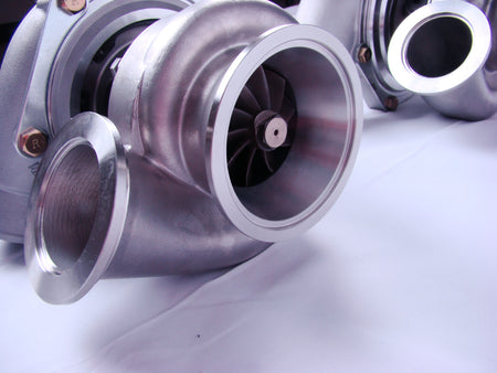 - Select your exhaust housing and you have a few different options. You can go with the cast traditional .63ar housing with the 3” 4 bolt outlet design. Or you have the new v-band inlet and 3” v-band outlet design in a .82ar, or 1.06ar.