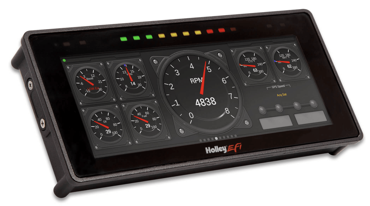 Holley's new 6.86" Pro Dash delivers over 200 monitoring channels of reliable real-time data in a more compact, full HD package suitable for nearly any motorsports application. Be assured that the Holley EFI 6.86" Pro Dash will deliver the vitals you need! The 6.86" Pro Dash is completely customizable for use in a variety of motorsports applications. It features a 6.86" 1280x480 resolution low glare, high brightness, high contrast, full-color capacitive touch screen for easy viewing even in the sun, plug and play connection to all Holley EFI systems as well as a weatherproof aluminum housing featuring flexible mounting options. Monitor the power of your Holley EFI system at a glance! Holley EFI 6.86" Pro Dash includes everything needed for installation! The Holley EFI 6.86" Pro Dash also features a plethora of inputs and outputs for expanded functionality of your Holley EFI installation. The included 34pin connector has 13 multi-configurable inputs for most Holley EFI sensors, such as pressure and temperature. Not using Holley EFI sensors? We still have you covered, these inputs are configurable, allowing you to utilize different sensor scaling calibrations! The Pro Dash also features two dedicated speed inputs, for RPM, Driveshaft speed, or any other Hall effect speed input. Need more outputs? The Pro Dash contains 4 ground switched outputs, that can be utilized with the switch panel feature to quickly turn on any of your auxiliary accessories, such as a master nitrous switch, or an electric water pump. We have also integrated a 10-LED Programmable shift light into the bezel of the dash and added 4 optional LED's that can be programmed for virtually anything, such as fuel pressure or oil pressure warning indicators, or a target boost indicator, the options are almost endless.