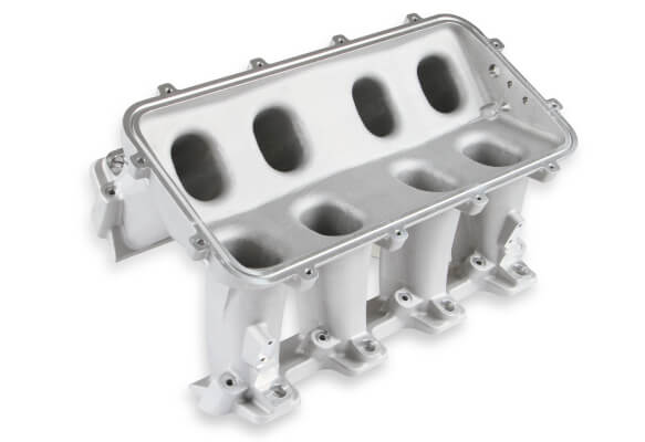 The Holley GM LS1/LS2/LS6 Modular Hi-Ram Intake Manifold is introduced as a cost-effective alternative to fabricated sheet-metal for high-performance applications where induction system height is not limited. Coupling this Hi-Ram intake with the high flowing LS1/LS2/LS6 style cylinder heads has outstanding potential for N/A and forced induction applications at a budget-minded cost. Aggressive, bold, race-bred styling will make bad intentions clear for drag race, muscle car, marine, off-road, sandrails, pulling trucks, track, street-rod applications and more! The base is designed to be modular in configuration to accept a wide range of carbureted and EFI tops and to be attractive to builders and fabricators as the foundation for custom induction systems. Runner length and the tapered cross-section designed to perform well for a wide range of engine configurations EFI fuel rails are machined for -8AN O-ring Fittings with passages large enough to accommodate high fuel flows and dampen pressure pulsations in the fuel system and come standard with EFI Hi-Ram kits. Cast aluminum construction. Intended for use on N/A or forced induction engines in the 6.0 to 7.0+ liter range, max power at 7000-8000+RPM.