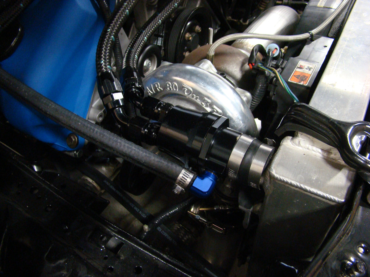 We developed this kit several years ago to clean up the install on the 4v cars running our turbo system and found out that a lot of other customers also were seeking this same product. What our system does is relocates the thermostat into the upper radiator line instead of its current factory position. Ford has the thermostat located after the radiator outlet which is going to see temperatures after coolant has already passed through the radiator. Relocating it up top where we have, this will have the thermostat reacting from a more actual engine temperature. This will allow for the car to operate cooler and have a much wider selection of thermostats that you can choose from. We use standard small block chevy(I know, I know) thermostats Also many people have issues after time with the factory coolant crossover leaking and needing replaced. This is a great option to not only replace the leaking factory unit but give the engine bay an updated look. Now you can replace the factory boring upper rubber hose with a more appealing braided line kit. This is sold separately and can be had for just $69. This includes your necessary AN fittings and 4' of our custom braided nylon black hose. Our kit is perfect for Marauder crowd which already has braced us and continues to be a big supporter of our product. Also the centrifugal supercharger users have the blower and air filter inlet directly in this path. Many of these people are running our products to allow for easier routing of the coolant line as well as the cooling benefits that come along with its use. We have customers running our kits on retrofitted 4v's into early cars, truck to cobra replica builds. Not only that the people running a blower on the 4v engines starts to look sloppy with the coolant lines routing all around it. This really allows you to run them however you might want to really clean up the look of the engine bay. Each kit has a 1 temp sensor port or 2 temp sensor ports. Depending on the car model its being used on, some have a secondary temp sensor which would require the 2nd option kit. If your planning on running an aftermarket coolant temp sensor, this is a very sleek way to gain access to the coolant for a hassle-free install. You would just choose option listed for the additional coolant temp sensor port: Key Details To v.2 Coolant Crossover Delete: