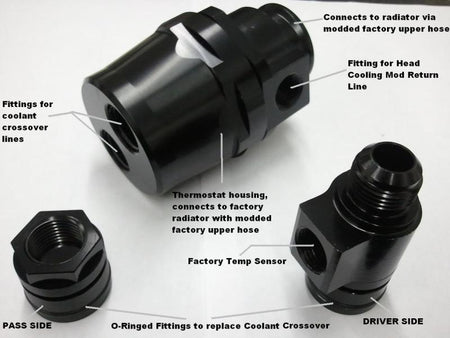 THIS KIT IN SPECIFIC IS THE SINGLE TEMP SENSOR PORT 3 PIECE KIT: Each 3pc kit will also include the hold down tabs and bolt to secure. A lot of the 4v guys also like to run the head cooling mod since its believed that the cylinder #7 & #8 have a pocket that doesn't allow for circulation. This heats up the coolant around this area and is believe to cause engine failure in some instances. We can also include an additional Head Cooling Mod fitting for the rear port of the head at the same time of purchase for $30.