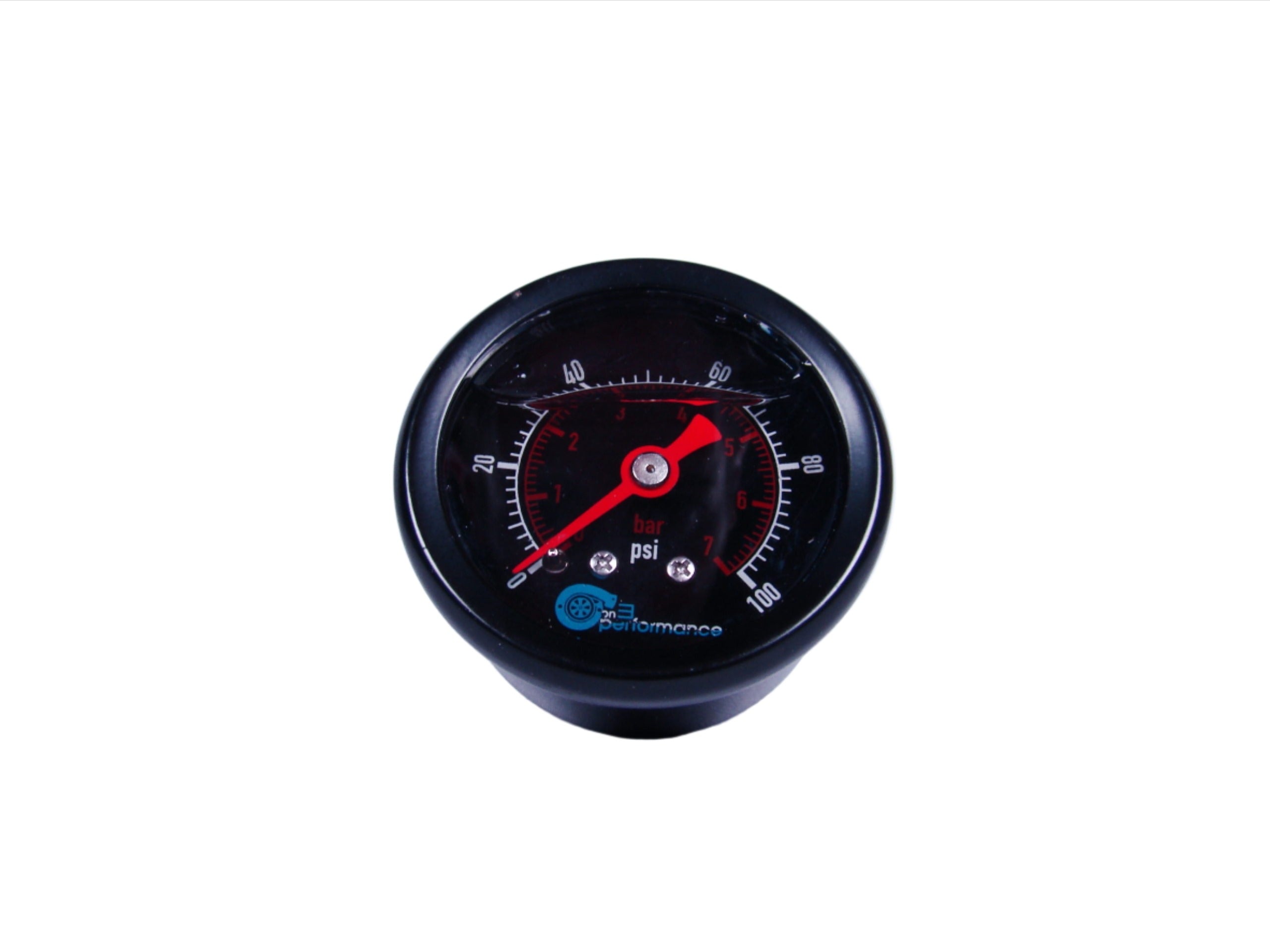 On 3 Performance liquid filled fuel pressure gauge. Shows 0-100psi and liquid filled. It offers 1/8" NPT male threads on the back.