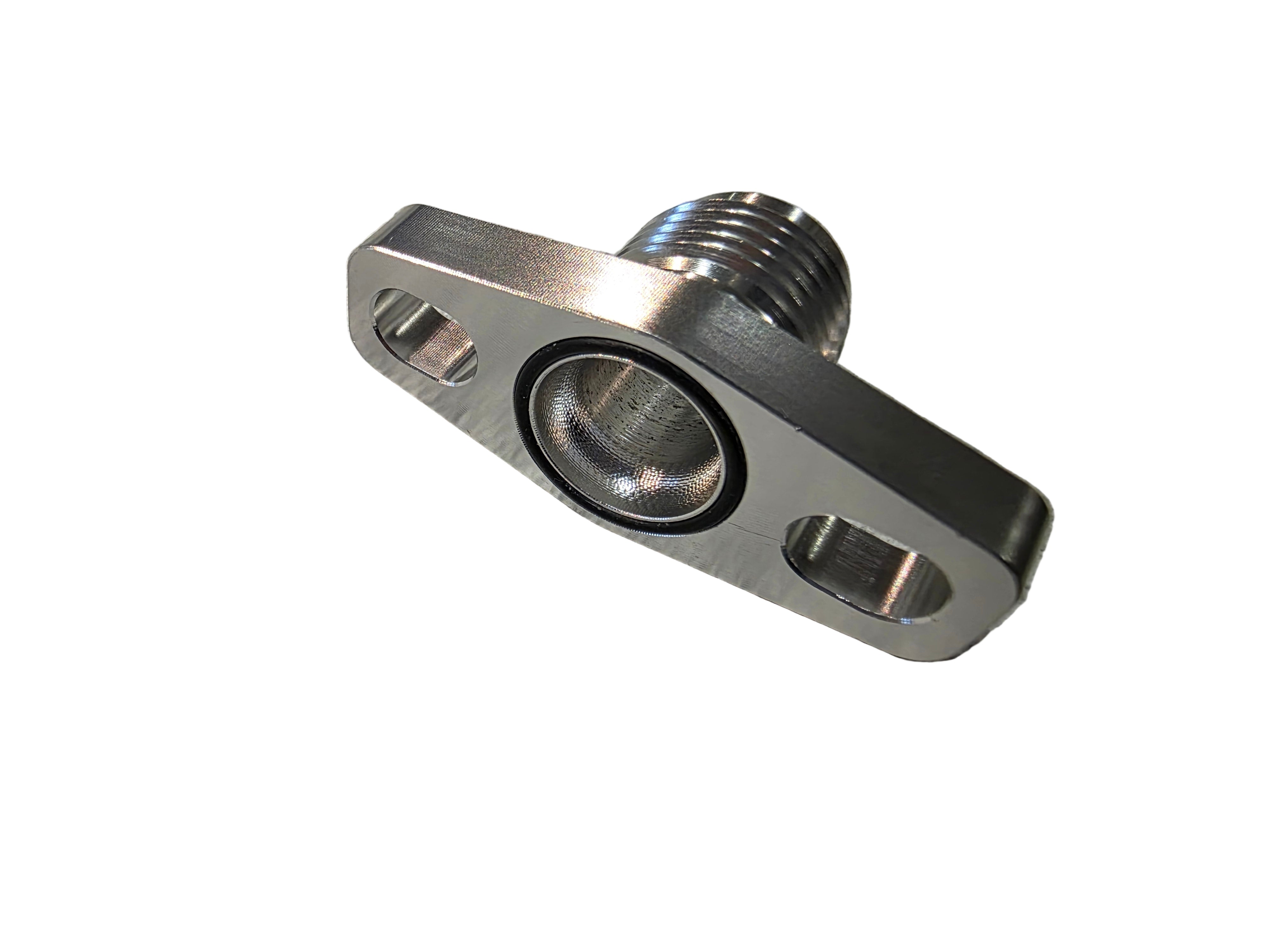 This is the proper oil feed and drain setup for our On 3 Performance line of turbochargers GT30 (55mm) & GT35 (61mm). This is what you would want if you are seeking a feed / drain system to go with your On3 turbocharger purchase. This is going to include the .035" stainless steel machined oil inlet restrictor as shown \n \nThe fittings are configured so that you would have a -4an fitting coming into the turbo for the feed and a 10an drain line. That will keep the turbo properly lubricated and draining, anything different is not recommended and this is the time proven and tested solution you will need. We also have a kit that will set you up with a hose barb outlet drain plate if you plan to run 5/8" hose for the drain.