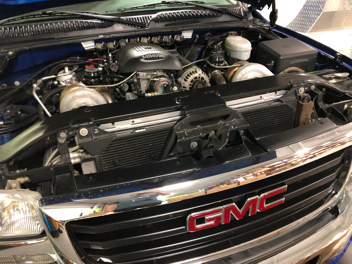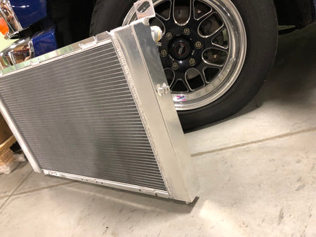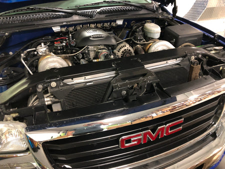 This is a brand new release that we have been testing with over the last 6 months in our shop twin turbo Sierra 1500. Most of the radiator upgrades you can find online are the same size as stock, why bother upgrading your radiator with one that's the same size? We wanted to increase coolant capacity by running the thickest upgraded core possible to help keep your vehicle cool in any condition. Our radiator has fabricated, polished end tanks, with a core that's almost double the standard size used. Our core measures in at 2.0" which virtually doubles the radiator capacity. We also have the trans cooler built into our radiator should you choose to run it through the radiator like the factory unit does. This is a very straight forward upgrade and installs with the factory mounting provisions.