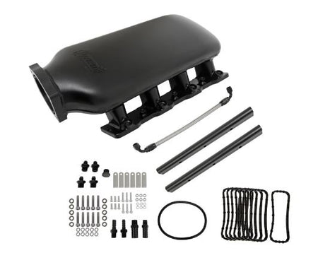 Our Summit Racing Max EFI LS intake manifolds feature a curved edge design with a large 9.7-liter plenum, for maximum flow and horsepower. They are available in both tall and low-profile, and satin or black anodized finishes. They include gaskets, mounting hardware, and a billet fuel rail kit.